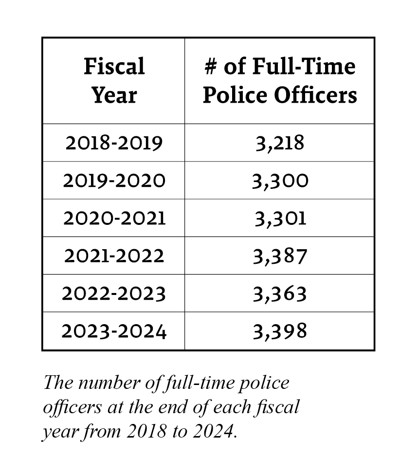 News articles from 2023 and 2024 mentioned a police shortage in the city, though a recent news clip from Fox 5 Las Vegas in November 2024 reported that there is a newfound interest in joining the police force after years of declining recruitment numbers. This is the only local news station that has reported anything recently on police numbers. The LVMPD’s annual reports seem to corroborate an increase of officers, with the force reporting 3,387 full-time police officers at the end of the 2021-2022 fiscal year, to 3,363 in the 2022-2023 fiscal year, and back up to 3,398 officers at the end of the 2023-2024 fiscal year.