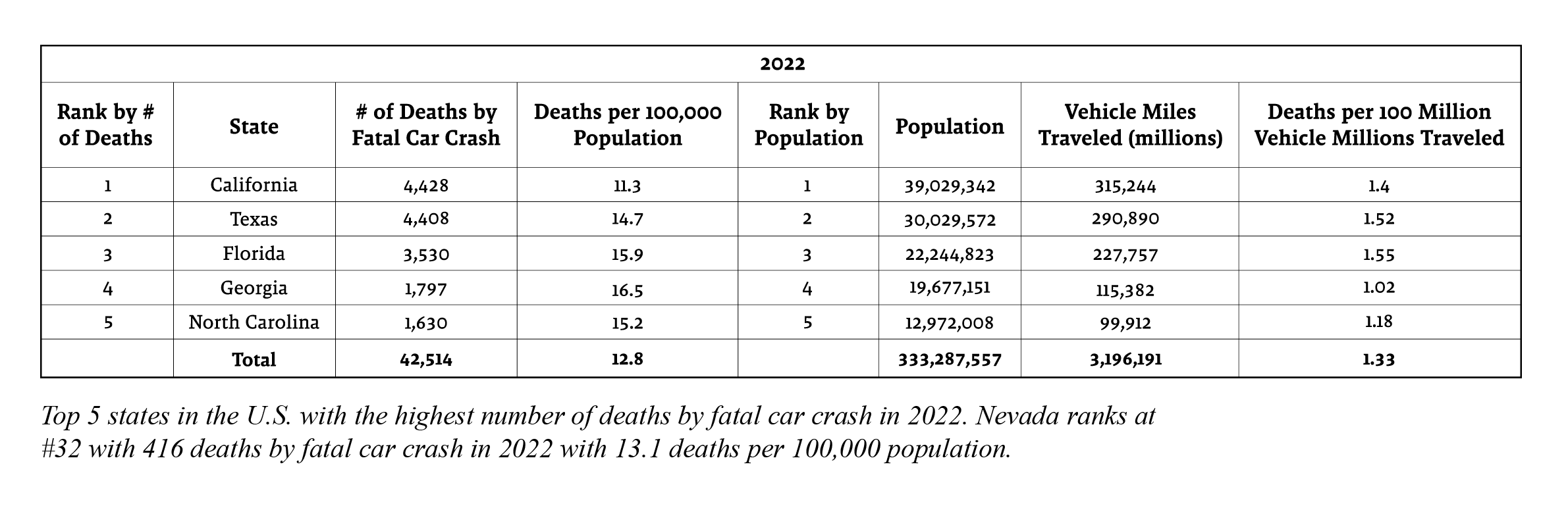 How Nevada compares to the whole country’s traffic fatalities can be difficult to grasp. Below are the top five states with the most fatal crashes in 2022 and where Nevada ranks, according to the Fatality and Injury Reporting System Tool (FIRST) by the National Highway Traffic Safety Administration, part of the U.S. Department of Transportation.