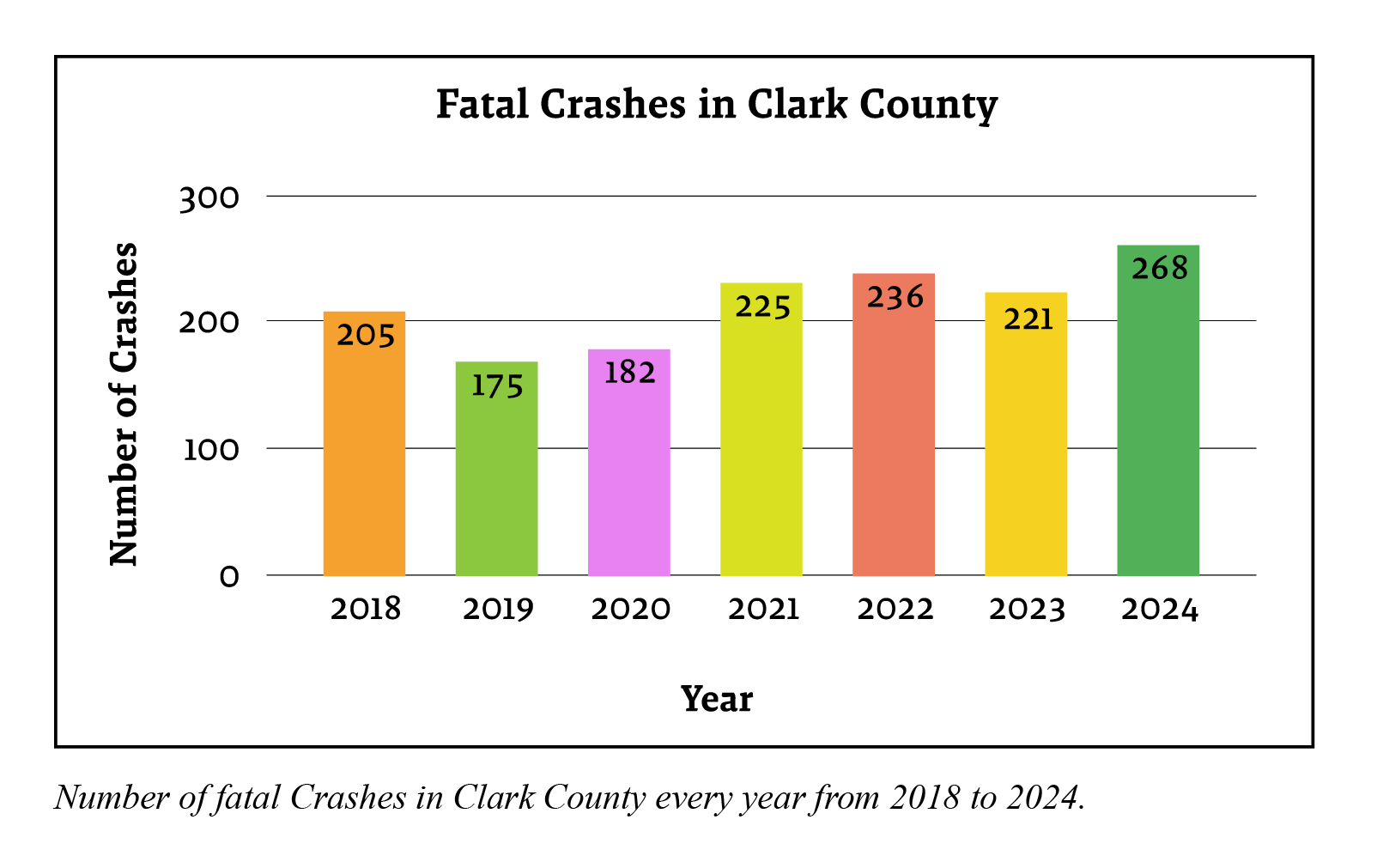 Driving in Las Vegas can ruin lives. Car accidents don’t just traumatize people—they kill them. Zero Fatalities, a program from the Nevada Department of Transportation and the Nevada Department of Public Safety, counted 293 dead drivers and passengers from car crashes in Clark County in 2024. There were 268 fatal crashes at the end of 2024, an increase from 2023’s total of 221 and an even greater increase from 2018’s 205 crashes.